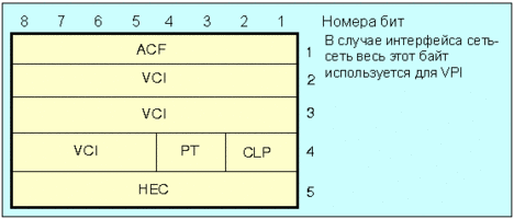 Рис. 4.1.9.2. Формат заголовка DQDB–пакета Поле ACF (access control field) служит для управления доступом. Поле VCI (virtual cannel identifier) - виртуальный идентификатор канала. Далее следуют поля: