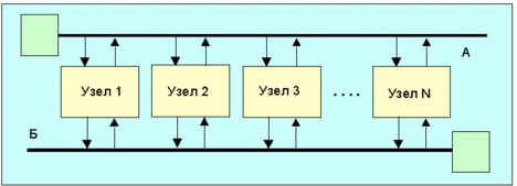 Рис. 4.1.9.3. Топология сети DQDB Каждый из узлов подключен к обеим шинам. По каждой из шин всегда циркулирует фиксированное число контейнеров. Содержимое контейнеров может передаваться с одной шины на другую. В сети DQDB используются следующие типы сегментов: