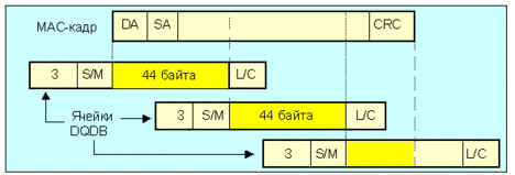 Поле MID остается идентичным для всех DQDB ячеек сегментированного МАС-кадра. Поле ACF содержит биты busy и request, которые используются в рамках механизма qpsx. Бит busy=1 указывает на то, что ячейка занята. Бит request=1 устанавливается узлом, который ждет возможности начать передачу. В каждом узле имеется счетчик запросов RC(request counter), который фиксирует число узлов, ожидающих передачи и стоящих в очереди впереди данного узла. Содержимое счетчика увеличивается всякий раз, когда по шине А проходит контейнер с битом busy=1. Счетчик декрементируется при появлении на шине Б контейнера со свободным битом request. Когда станция сама намеривается передать кадр, содержимое RC переносится в реверсивный счетчик DC, а в регистр RC заносится нуль. Код в DC уменьшается на единицу при получении контейнера с битом busy=1. DC определяет положение запроса в очереди (нуль соответствует началу очереди). Если получен контейнер с request=0 и DC=0, узел может передать ячейку по данной шине. Каждый узел может осуществлять передачу и прием по любой из шин А и Б. В сети DQDB предусмотрено 4 уровня приоритетов и каждый узел поддерживает до 5 очередей с RC и DC счетчиками для каждой из очередей. Для индикации приоритета в поле ACF предусмотрено 4 двоичных разряда (R1, R2, R3 и R4). Высшему приоритету соответствует R4. Схема сегментирования MAC-кадра при передаче с помощью DQDB ячеек показана на рис. 4.1.9.4.