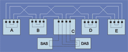 Оглавление: Телекоммуникационные технологии Вперёд: 4.1.7. Параллельный сетевой интерфейс HIPPI 4.1.6. Сети FDDIСемёнов Ю.А. (ГНЦ ИТЭФ), book.itep.ruОдной из наиболее популярных сетей, использующих оптическое волокно, (не считая fast ethernet) является FDDI. FDDI (fiber distributed data interface, ISO 9314-1, rfc-1512, -1390, -1329, -1285 - смотри также http://iquest.com/~nmaller/fddi.htm) стандарт американского института стандартов (ansi), принятый без изменения ISO. Протокол рассчитан на физическую скорость передачи информации 100 Мбит/с и предназначен для сетей с суммарной длиной до 100км (40 км для мультимодовых волокон) при расстоянии между узлами 2 км или более. Частота ошибок в сети не превышает 10-9. В FDDI используется схема двойного кольцевого счетчика (рис. 4.1.6.1; буквами a,b,c,d и e обозначены станции-концентраторы). Кольцевая схема единственно возможное решение для оптического волокна (не считая схемы точка-точка). Для доступа к сети используется специальный маркер (развитие протокола IEEE 802.5 - Token Ring). Сети FDDI не имеют себе равных при построении опорных магистралей (backbone) локальных сетей, позволяя реализовать принципиально новые возможности – удаленную обработку изображений и интерактивную графику. Обычно устройства (DAS - dual attached station) подключаются к обоим кольцам одновременно. Пакеты по этим кольцам движутся в противоположных направлениях. В норме только одно кольцо активно (первичное), но при возникновении сбоя (отказ в одном из узлов) активизируется и второе кольцо, что заметно повышает надежность системы, позволяя обойти неисправный участок (схема соединений внутри станций-концентраторов на рис. 4.1.6.1 является сильно упрощенной). Предусмотрена возможность подключения станций и только к одному кольцу (SAS - single attached station), что заметно дешевле. К одному кольцу можно подключить до 500 das и 1000 sas. Сервер и клиент имеют разные типы интерфейсов.