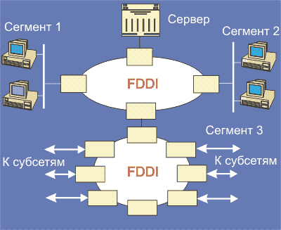 Рис. 4.1.6.7. Схема использования кольца FDDI для расширения пропускной способности локальной сети При обрывах оптоволокна возможно частичное (при двух обрывах) или полное (при одном обрыве) восстановление связности сети.