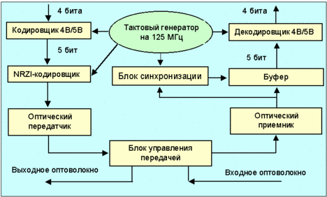 Рис. 4.1.6.2. Схема протокольных подуровней для FDDI Уровень MAC (media access control) определяет доступ к сетевой среде, включая формат кадров, адресацию, алгоритм вычисления crc и механизм исправления ошибок. Уровень PHY (physical layer protocol) задает процедуру кодирования/декодирования, синхронизацию, формирование кадров и пр. В качестве базовой используется кодировка 4b/5b (преобразование 4-битного кода в 5-битный), а в канале - NRZI. Уровень PMD (physical layer medium) определяет характеристики транспортной среды, включая оптические каналы, уровни питания, регламентирует частоту ошибок, задает требования к оптическим компонентам и разъемам. Блок схема интерфейса между уровнями MAC и PHY показана на рис. 4.1.6.3.