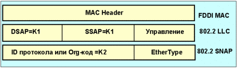 Рис. 4.1.6.4. Структура некоторых полей заголовков пакетов Полная длина LLC- и SNAP-заголовков составляет 8 октетов. Десятичное значение k1 равно 170 . Для преобразования 16- или 48-разрядного FDDI-адреса в 32-разрядный IP-адрес используется протокол ARP. Операционный код равен 1 для запроса и 2 для отклика. Спецификация FDDI MAC определяет максимальный размер кадра равным 4500 октетам, включая 16-октетную преамбулу. Преамбула состоит из кодов 11111, стартовый разделитель имеет вид 1100010001, а оконечный разделитель - 0110101101 (во всех случаях применена 5-битовая нотация). Контрольная сумма CRC вычисляется для полей, начиная с поля управление по данные включительно.