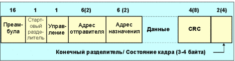 Рис. 4.1.6.6. Формат кадра-маркера 802.2 класс I LLC требует поддержки команд ненумерованная информация (UI), команд и откликов exchange identification (XID), а также test. Станции не обязаны уметь передавать команды XID и test, но должны быть способны посылать отклики. Командные кадры идентифицируются по нулевому младшему биту SSAP-адреса. Кадры-отклики имеют младший бит SSAP-адреса равный 1. UI-команды содержат в управляющем поле LLC код 3. Команды/отклики XID имеют код поля LLC, равный 175 (значение десятичное) при значении бита poll/final=0 или 191 при poll/final=1. Код управления LLC для команд/откликов test равен 227, если poll/final=0, и 243 при poll/final=1. Отклики и команды UI при poll=1 игнорируются. Команды UI, имеющие отличные от snap sap в DSAP- или SSAP-полях, не считаются пакетами IP или ARP. При получении команд XID или test должен быть послан соответствующий отклик. Отклик посылается, когда DSAP равен SNAP SAP (170), null SAP (0), или при global SAP (255). При других DSAP отклики не посылаются. При посылке отклика на команды XID или test, значение бита final отклика должно быть равно значению бита poll команды. Кадр отклика XID должен включать в себя информационное поле 802.2 XID 129.1.0, указывающее на класс услуг 1 (не требующих установления связи). Кадры отклика test должны соответствовать информационному полю кадра команды test. Для начала передачи станция должна получить в свое распоряжение маркер. Если станция находится в пассивном состоянии, она передает маркер следующей станции. Но из-за большой протяженности колец FDDI время задержки здесь заметно больше, чем в случае Token Ring. В кольце FDDI может находиться несколько кадров одновременно. Станция сама удаляет кадры из кольца, посланные ей самой. Все станции должны иметь таймер вращения маркера (TRT – token rotation time), который измеряет время с момента, когда станция последний раз принимала этот пакет. Имеется переменная TTRT (target token rotation time). Значение TRT сравнивается с TTRT и только приоритетные кадры могут быть переданы при TRT> TTRT. Обычная передача данных контролируется таймером THT (token hold timer). Когда станция получает маркер, она заносит TRT в таймер THT, который начинает обратный отсчет. Станция может посылать кадры до тех пор, пока THT остается больше TTRT. В действительности THT определяет максимальное число октетов (символов), которое может быть послано станцией в рамках одного кадра (THT задает предельное время, в течение которого станция может передавать данные). IEEE специфицирует числа как последовательности бит, где младший бит передается первым. В протоколах Интернет порядок бит другой, что может вызывать ошибки. Ниже приведена краткая таблица (4.1.6.1) соответствия для некоторых из чисел. Таблица 4.1.6.1