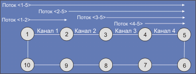 Рис. 1. Чтобы полностью использовать имеющиеся ресурсы на участке <1-2>, можно пропустить через канал еще 3/4 от того, что протекает между узлами 1 и 5. Чтобы максимально возможно использовать имеющиеся ресурсы, узлы должны взаимодействовать друг с другом. Таким образом, для обеспечения равенства доступа к ресурсам алгоритм должен дросселировать трафик на входе узлов. В RPR также как и в Ethernet пакет удаляется в точке назначения, что позволяет использовать незадействованную часть кольца. RPR реализует алгоритм распределенного выравнивания возможностей для разных потоков. Протокол не использует алгоритм STP и по этой причине может работать с замкнутыми маршрутами без ограничений. Кольца RPR транспортируют пакеты по пути вдоль кольца с минимальным числом шагов. Если какой-то узел или двунаправленный участок кольца откажет, RPR формирует альтернативный маршрут за время не более 50 мсек. Например, если канал между узами 4 и 5 будет оборван, узлы 4 и 5 будут соединены по маршруту 4-3-2-1-10-9-8-7-6-5. Наконец, в RPR можно определить несколько классов трафика, что крайне важно для мультимедийных приложений. Класс А реализует канальное соединение между узлами кольца с гарантированной полосой, задержкой доставки и дисперсией времени доставки (аналогично SONET, но без ограничений дискретных значений полосы - OC-3, OC-12 и т.д.). Класс В имеет гарантированную полосу, но допускает кратковременные возрастания трафика сверх согласованных значений за счет потоков, которые не имеют гарантии полосы. Класс С предлагает услуги типа "лучшее-что-возможно", при этом не гарантируются никакие параметры трафика. Целью RPR является одновременное достижение равных возможностей для разных потоков и высокая эффективность использования имеющихся ресурсов. Достижение равных возможностей можно проследить на примере реализации алгоритма "parallel parking lot" на рис. 1. Региональный сервис-провайдер стремится предоставить равные возможности всем клиентам, вне зависимости оттого, к какому узлу они подключены. На рис. 1 это означает предоставление каждому из потоков 1/4 полосы пропускания узла 5. Требования высокой эффективности использования ресурсов предполагают возможность привлечения всех ресурсов, незадействованных для обеспечения равных возможностей для всех конкурирующих потоков. Примером использования имеющихся ресурсов является поток между узлами 1 и 2 на рис. 1, который использует до 75% пропускной способности этого канала. Если реализовать указанные цели, то любые два узла в кольце смогут обмениваться данными со скоростью, ограниченной уровнем насыщения (перегрузки) канала. Таким образом, целью алгоритма справедливого распределения ресурсов является дросселирование потоков во входных точках, чтобы обеспечить равенство доступа к ресурсам. Это означает, что в случае, показанном на рис. 1, поток между узлами 1 и 5 должен быть дросселирован в точке 1 до уровня 0.25 от пропускной способности участка 4-5, оставляя доступной полосу на участке 1-2 на уровне 75%. Такое идеальное поведение может быть описано с помощью модели RIAS (Ring Ingress Aggregated with Spatial Reuse). Модель RIAS содержит в себе два ключевых компонента. Первый - определяет степень гранулярности трафика для определения справедливости распределения ресурсов. Модель RIAS гарантирует, что все узлы отправители получат равные доли полосы пропускания для