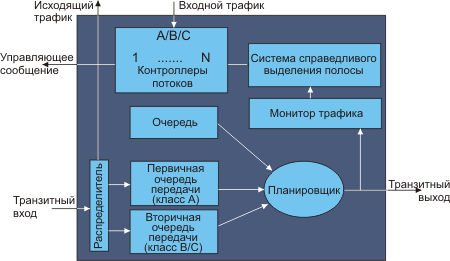 Рис. 2. Узлы RPR имеют модули измерения (счетчики байт), которые контролируют информационный поток станции и транзитные потоки. Результаты этих измерений используются алгоритмом справедливого распределения ресурсов полосы пропускания (fairness algorithm) для вычисления параметров управляющего сигнала, направляемого вышестоящим узлам для дросселирования их потоков. Узлы, которые получают такие сообщения, используют полученные данные совместно с локальной информацией для управления контроллерами входных потоков (см. рис. 2). Узел, кроме того, содержит планировщик, который осуществляет арбитраж для внутренних и транзитных потоков. В режиме одной очереди для транзитного потока имеется один буфер типа FIFO, эта очередь называется PTQ (primary transit queue). В этом случае планировщик предоставляет абсолютный приоритет транзитному трафику по отношению к локальному. В режиме двойной очереди (dual-queue mode) имеется две транзитные очереди, одна для класса А (PTQ) и одна для класса В и С - STQ (secondary transit queue). В этом режиме планировщик всегда обслуживает в первую очередь трафик класса А. Трафик класса А самой станции будет обслужен сразу после PTQ, если STQ не заполнена. В противном случае планировщик обслуживает сначала трафик STQ, гарантируя отсутствие потерь. При прочих равных условиях планировщик использует карусельный принцип обслуживания очереди STQ для транзитного трафика и трафика станции классов В и С до тех пор, пока не будет достигнут порог для STQ. Когда достигается порог буфера STQ, транзитный трафик STQ получает преимущество по отношению к трафику станции. В обоих случаях определяющим является стремление к простоте оборудования (исключение дорогостоящих решений с индивидуальными очередями для каждого потока или каждого входа) и подавлению потерь. Пакет, вошедший в кольцо не должен быть потерян в последующих узлах. Существуют два режима работы алгоритма справедливого распределения полосы RPR. Первый из них - агрессивный (АМ - aggressive mode) происходит от протокола SRP (Spatial Reuse Protocol), широко используемого во многих региональных сетях. Второй консервативный режим СМ связан с алгоритмом Аладдина. Оба режима работают схожим образом. Перегруженный узел, размещенный ниже по течению, передает свое состояние перегрузки узлам вверх, так что они дросселируют свой трафик, обеспечивая достаточную полосу транспортировки для станции внизу. Чтобы достичь этого, перегруженный узел передает информацию вверх по течению и все узлы, расположенные там, должны соответствующим образом дросселировать свои потоки. Спустя некоторое время перегрузка ослабеет, и все узлы получат справедливые доли пропускной способности. Аналогично, когда перегрузка исчезает, станции станут периодически увеличивать свой темп отправки данных, таким образом, получая максимально возможную долю полосы пропускания. Существует два ключевых параметра для управления полосой пропускания в RPR, это forward_rate и add_rate. Первый представляет загрузку от транзитного трафика, а второй - полную загрузку от трафика станции. Оба параметра измеряются в байтах за фиксированный период времени (aging_interval). Измерение обеих величин производится на выходе планировщика и подвергается экспоненциальному усреднению. Один раз за aging_interval каждый узел проверяет свое состояние перегрузки c учетом режима работы (АМ/CM). Когда узел N перегружен,