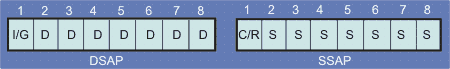 Рис. 4.1.1.3.5. Вложение пакетов Интернет в Ethernet- и IEEE 802 пакеты LLC - управление логической связью (logical link control); DSAP = 0xaa (destination service access point) - поле адреса доступа к службе получателя; SSAP = 0xaa (source service access point) - поле адреса доступа к службе отправителя; SNAP - протокол доступа к субсетям (subnetwork access protocol). PAD - поле заполнитель. В общем случае форматы полей DSAP и SSAP имеют вид, показанный на рис. 4.1.1.3.6 I/G = 0 - индивидуальный адрес, I/G =1 - групповой адрес; D - бит адреса службы места назначения, S - бит адреса службы отправителя; C/R =0 - команда, C/R =1 - подтверждение.