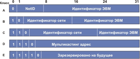 Рис. 4.1.1.3.2. Структура IP-адресов (NetID = идентификатор сети) Для удобства чтения IP-адреса обычно записываются в десятично-точечной нотации, например: 192.148.166.129 (адрес класса C). Классу A соответствует диапазон адресов 1.0.0.0 - 127.255.255.255. Ряд адресов является выделенными для специальных целей: 0.0.0.0 - обращение к ЭВМ, на которой производится работа;