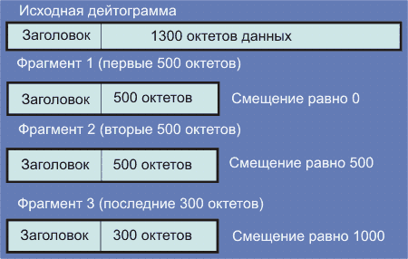 Рассмотрим по фрагментную передачу дейтограммы с длиной в 1300 октетов в предположении, что более 576 октетов за один раз передать нельзя.