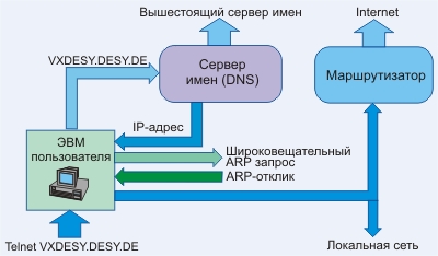 Оглавление: Телекоммуникационные технологии Вперёд: 4.1.1.4. Повторители, мосты, мультиплексоры, переключатели и маршрутизаторы 4.1.1.3. Интернет в EthernetСемёнов Ю.А. (ГНЦ ИТЭФ), book.itep.ruВ Интернет не существует иерархии сетей. Локальная сеть на основе Ethernet, две ЭВМ, связанные через последовательный интерфейс, или общенациональная сеть страны - это все сети и по логике Интернет они все равны. Каждая сеть имеет свое имя и как минимум один IP-адрес. Имя привычнее для людей, адреса - для машин. Между именами и адресами существует строгое соответствие. Для того чтобы пояснить взаимодействие различных систем в сети, рассмотрим сильно упрощенную схему обработки команды telnet vxdesy.desy.de, которая предполагает осуществление удаленного доступа к vx-кластеру в ДЕЗИ, Гамбург (вызов через windows обрабатывается практически аналогично). Сначала ЭВМ выделяет команду telnet и запускает соответствующую программу. Эта программа рассматривает символьный адрес vxdesy.desy.de в качестве параметра команды telnet.