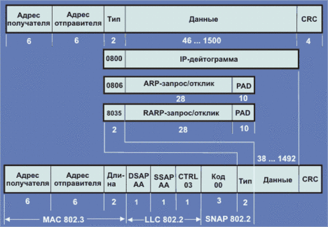 Рис. 4.1.1.3.6. Структура адресов DSAP и SSAP Поле CNTL может иметь длину 1 или 2 байта, а его структура соответствовать I, S или U-форматам (см. разделы "Эталонная модель iso" и "x.25"). В однобайтовых полях DSAP и SSAP записывается код типа протокола сетевого уровня. Для протоколов IPX/SPX это и последующее поле содержат код 0xE0. Поле CNTL=03 обозначает нечисловой формат для уровня ethernet 802.2. Эти три байта часто представляют собой код производителя, как правило, совпадающий с первыми тремя байтами адреса отправителя. Иногда они просто делаются равными нулю. Поле тип (2 байта) характеризует используемую версию Ethernet. Из рисунка 4.1.1.3.5 видно, что первые два поля (адреса получателя и отправителя) и последнее поле (CRC) во всех форматах идентичны. При расчете CRC содержимое кадра рассматривается как двоичный полином. Производится деление этого кода на специальный образующий полином. Полученный остаток от деления дополняется по модулю один, результирующий код и считается контрольной суммой CRC. В поле адрес получателя может быть записан код 0xffffffffffff, что указывает на широковещательную адресацию кадра. Адрес отправителя такой код содержать не может. Третье поле может служить для выявления типа используемого протокола. Если в этом поле содержится число более 1500 (десятичное), это указывает на то, что данный кадр имеет формат Ethernet II, а само поле содержит не длину кадра а тип данных. Теперь, надеюсь, читателю понятно, почему кадр Ethernet 802.3 не может содержать более 1500 байт. Кадр Ethernet 802.2 помимо первых трех полей содержит дополнительные три однобайтовые поля, следующие вслед за ними (DSAP, SSAP и CNTL). Кадр Ethernet SNAP является модификацией кадра Ethernet 802.2. Для этого кадра коды полей dsap и ssap равны 0xAA (признак кадра Ethernet SNAP), код CNTL=03 (нечисловой формат), поле код организации (3 байта, характеризует организацию сети) равен нулю (для IPX/SPX), а двухбайтовое поле тип характеризует протокол высокого уровня. Для протоколов IPX/SPX в этом поле должен быть записан код 0x8138 (для ip - 0x0800, для arp - 0x0806, для rarp - 0x8035, а для Apple Talk - 0x809b). Таблица кодов протоколов приведена в приложении Базовые протоколы Интернет (см. также RFC-1700). Поля тип протокола и по смыслу и по содержанию идентичны для всех разновидностей кадра Ethernet (кроме ieee 802.3). Транспортный уровень должен воспринимать данные от нескольких пользовательских программ и пересылать их на более низкий уровень. Многоуровневые протоколы спроектированы так, чтобы слой N по месту назначения получал ту же самую информацию, что была послана слоем N отправителя. Прикладные программы также как и все протокольное программное обеспечение уровня Интернет и выше использует только IP-адреса (32 бита), в то время как уровень сетевого программного обеспечения работает с физическими сетевыми адресами (так Ethernet использует 48-битные адреса). Когда IP-дейтограмма попадает в ЭВМ, сетевое программное обеспечение передает ее программе IP-уровня. Если адрес места назначения совпадает с IP-адресом ЭВМ, дейтограмма принимается и передается на более высокий уровень для дальнейшей обработки. При несовпадении адресов дейтограмма уничтожается (переадресация дейтограмм для ЭВМ запрещена, это функция маршрутизатора). Хотя можно заставить ЭВМ выполнять задачи маршрутизации, с точки зрения Интернет-философии это плохая идея. Различные сети и каналы имеют разные скорости обмена и надежность передачи. Это оп