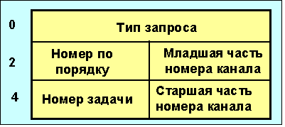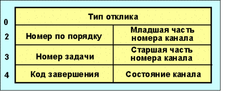 Поле номер по порядку используется для отслеживания последовательности связи между клиентом и сервером. Клиент записывает в это поле код, равный номеру по порядку плюс единица. В полях номера канала записан номер, присвоенный клиенту при его регистрации сервером. Поле номер задачи идентифицирует каждую из задач, сделавших запрос. Сервер следит за выполнением задачи и освобождает ресурсы при завершении выполнения. Номер задачи равный нулю говорит серверу, что все задания окончены. Старшая часть номера канала используется лишь при наличии более чем 1000 пользователей, в остальных вариантах это субполе содержит нуль. Сервер в своем отклике сообщает клиенту результаты выполнения его запроса. Отклик, также как и запрос, вкладывается в IPX/SPX-пакет. Формат пакета-отклика показан на рис. 4.2.1.3.2.