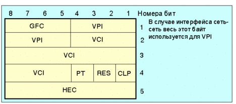 Рис. 4.3.5.2 Формат заголовка ATM-пакета (сетевой интерфейс пользователя - UNI) Для интерфейса сеть-сеть (NNI) используется ячейка с несколько иным форматом заголовка. Там весь первый октет выделен для VPI, а поле GFC отсутствует.