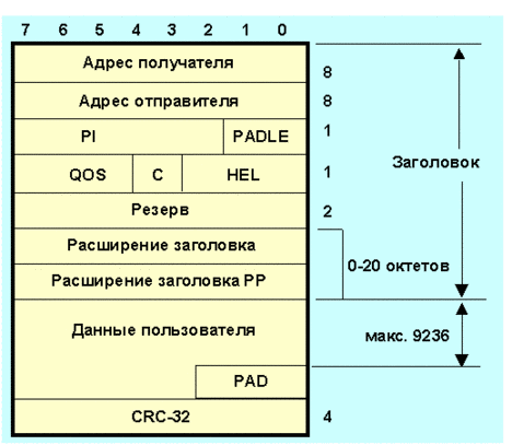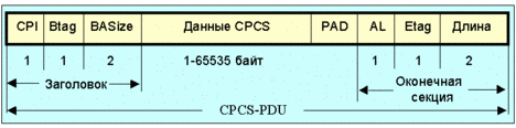 При вычислении crc используется образующий полином G(x) = x11 + x9 + x5 + x4 + x +1. Подуровень конвергенции aal содержит общую часть подуровня CPCS (common path convergence sublayer) и служебную часть подуровня SSCS (service specific convergence sublayer). CPCS обеспечивает негарантированную доставку кадров любой длины в диапазоне 1-65535 байт. Данные пользователя передаются непосредственно на субуровень AAL. Формат протокольного блока данных подуровня конвергенции AAL 3/4-типа показан на рис. 4.3.5.7.