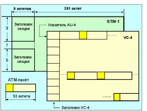 Рис. 4.3.5.9. Положение уровней ATM в универсальной модели Верхние уровни управления для ATM базируются на рекомендациях ccitt I450/1 (Q.930/1). В случае использования ATM для Интернет значение MTU по умолчанию равно 9180 (RFC-1626), так как фрагментация IP-дейтограмм крайне нежелательна (AAL). Работа протоколов TCP/IP поверх ATM описана в документах RFC-1483, -1577, -1626, -1680, -1695, -1754, -1755, -1821, -1926, -1932 (полужирным шрифтом выделены коды документов, являющиеся стандартами Интернет). Ниже на рис. 4.3.5.10 показано, как пакеты atm размещаются в кадрах STM-1 (виртуальный контейнер VC-4).