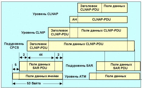 Проблему фрагментации и инкапсуляции этих длинных пакетов в АТМ ячейки берет на себя коммутатор доступа. Схема вложения и фрагментации для пакетов clnap отображена на рис. 4.3.5.19. Из рисунка видно, что на подуровне SAR происходит деление пакета на части и укладка полученных сегментов в поля данных ячеек (48 байт).
