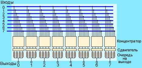 Рис. 4.3.5.20. Формат IP PDU при транспортировке с использованием AAL5 ATM Пропускная способность сети АТМ (150 Мбит/с) позволяет передавать немного более 360000 ячеек в секунду, что означает для ATM-переключателя время коммутации менее 2,7 мксек. Реальный переключатель может иметь от 16 до 1024 входных линий, что может означать коммутацию 16-1024 ячеек каждые 2,7 мксек. При быстродействии 622 Мбит/с новая порция ячеек поступает каждые 700 нсек. Постоянство длины ячеек упрощает конструкцию ключа. Все АТМ-ключи имеют целью обеспечить коммутацию с минимальной вероятностью потери и исключить возможность изменения порядка следования ячеек. Приемлемой считается вероятность потери ячейки не более 10-12. Это эквивалентно для большого коммутатора потери 1-2 ячеек в час. Уменьшению вероятности потери способствует создание буферов конвейерного типа. Если на вход переключателя приходят две ячейки одновременно, одна из них обслуживается, а вторая ставится в очередь (запоминается в буфере). Выбор ячеек может производиться псевдослучайно или циклически. При этом не должно возникать предпочтений для каких-то каналов. Если в один цикл на вход (каналы 1, 2, 3 и 4) коммутатора пришли четыре ячейки, предназначенные для выходных линий J+2, J, J+2 и J+1, соответственно, то на линии J+2 возникает конфликт. Предположим, что будет обслужена ячейка, поступившая по первой входной линии, а ячейка на входной линии 3 будет поставлена в очередь. В начале следующего цикла на выход попадут три ячейки. Предположим также, что в этот цикл на ходы коммутатора (1 и 3) придут ячейки адресованные для линий J+3 и J, соответственно. Ячейка, адресованная J, будет поставлена в очередь вслед за ячейкой, адресованной J+2. Все эти ячейки будут переданы только на 4-ом цикле. Таким образом, попадание в очередь на входе ячейки блокирует передачу последующих ячеек даже если выходные каналы для их передачи свободны. Чтобы исключить блокировку такого рода можно организовать очередь не на входе, а на выходе коммутатора. При этом для коммутатора с 1024 входами теоретически может понадобиться 1024 буфера на каждом выходе. Реально число таких буферов значительно меньше. Такая схема АТМ-коммутатора (8*8) показана на рис. 4.3.5.21.