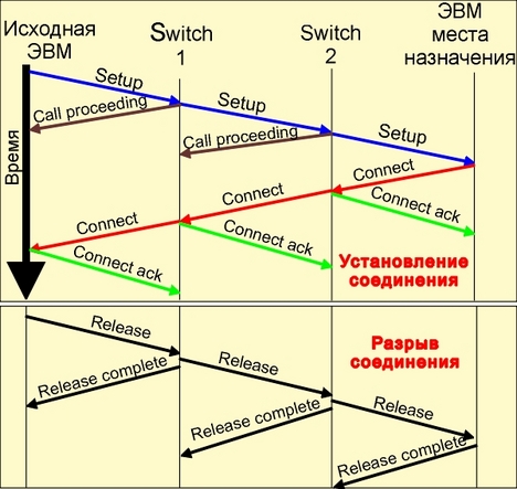 Схема обмена сообщениями при установлении (и разрыве) виртуального соединения показана на рис. 4.3.5.1. Предполагается, что между ЭВМ-инициализатором и ЭВМ-адресатом находится два ATM-переключателя. Каждый из узлов по пути к месту назначения при получении запроса setup откликается, посылая сообщение call proceeding. Адрес места назначения указывается в сообщении setup. В ATM используется три вида адресов. Первый - имеет 20 байт и имеет структуру OSI-адреса. Первый байт указывает на вид адреса (один из трех). Байты 2 и 3 указывают на принадлежность стране, а байт 4 задает формат последующей части кода адреса, которая содержит 3 байта кода администрации (authority), 2 байта домена, 2 байта области и 6 байтов собственно адреса. Во втором формате байты 2 и 3 выделены для международных организаций, а не стран. Остальная часть адреса имеет тот же формат, что и в варианте 1. Третий формат является старой формой (CCITT E.164) 15-цифровых десятичных телефонных номеров ISDN. В ATM не специфицировано никакого алгоритма маршрутизации. Для выбора маршрута (от коммутатора к коммутатору) используется поле VCP. VCI используется лишь на последнем шаге, когда ячейка посылается от переключателя к ЭВМ. Такой подход упрощает маршрутизацию отдельных ячеек, так как при этом анализируется 12- а не 28-битовые коды. В каждом коммутаторе (переключателе) формируются специальные таблицы, которые решают проблему переадресации ячеек. Следует обратить внимание на то, что виртуальный канал (circuit) и виртуальный проход (path) в данном контексте не тождественны. Виртуальный проход (маршрут) может содержать несколько виртуальных каналов. Виртуальные каналы всегда являются полностью дуплексными.