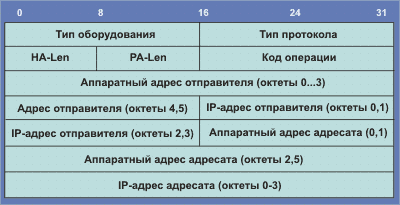 4.4.6. Протокол преобразования адресов ARPСемёнов Ю.А. (ГНЦ ИТЭФ), book.itep.ruЛюбое устройство, подключенное к локальной сети (Ethernet, FDDI и т.д.), имеет уникальный физический сетевой адрес, заданный аппаратным образом. 6-байтовый Ethernet-адрес выбирает изготовитель сетевого интерфейсного оборудования из выделенного для него по лицензии адресного пространства. Если у машины меняется сетевой адаптер, то меняется и ее Ethernet-адрес. 4-байтовый IP-адрес задает менеджер сети с учетом положения машины в сети Интернет. Если машина перемещается в другую часть сети Интернет, то ее IP-адрес должен быть изменен. Преобразование IP-адресов в сетевые выполняется с помощью arp-таблицы. Каждая машина сети имеет отдельную ARP-таблицу для каждого своего сетевого адаптера. Не трудно видеть, что существует проблема отображения физического адреса (6 байт для Ethernet) в пространство сетевых IP-адресов (4 байта) и наоборот. Протокол ARP (address resolution protocol, RFC-826) решает именно эту проблему - преобразует ARP- в Ethernet-адреса. Рассмотрим процедуру преобразования адресов при отправлении сообщения. Пусть прикладная программа одной ЭВМ отправляет сообщение другой. Прикладной программе IP-адрес места назначения обычно известен. Для определения Ethernet-адреса просматривается ARP-таблица. Если для требуемого IP-адреса в ней присутствует Ethernet-адрес, то формируется и посылается соответствующий пакет. Если же с помощью ARP-таблицы не удается преобразовать адрес, то выполняется следующее: 1. Всем машинам в сети посылается пакет с ARP-запросом (с широковещательным Ethernet-адресом места назначения). Каждая машина, принявшая ARP-запрос, в своем ARP-модуле сравнивает собственный IP-адрес с IP-адресом в запросе. Если IP-адрес совпал, то прямо по Ethernet-адресу отправителя запроса посылается ответ, содержащий как IP-адрес ответившей машины, так и ее Ethernet-адрес. После получения ответа на свой ARP-запрос машина имеет требуемую информацию о соответствии IP и Ethernet-адресов, формирует соответствующий элемент ARP-таблицы и отправляет IP-пакет, ранее поставленный в очередь. Если же в сети нет машины с искомым IP-адресом, то ARP-ответа не будет и не будет записи в ARP-таблицу. Протокол IP будет уничтожать IP-пакеты, предназначенные для отправки по этому адресу. Протоколы верхнего уровня не могут отличить случай повреждения в среде ethernet от случая отсутствия машины с искомым IP-адресом. Во многих реализациях в случае, если IP-адрес не принадлежит локальной сети, внешний порт сети (gateway) или маршрутизатор откликается, выдавая свой физический адрес (режим прокси-ARP). Функционально, ARP делится на две части. Одна - определяет физический адрес при посылке пакета, другая отвечает на запросы других машин. ARP-таблицы имеют динамический характер, каждая запись в ней "живет" определенное время после чего удаляется. Менеджер сети может осуществить запись в ARP-таблицу, которая там будет храниться "вечно". ARP-пакеты вкладываются непосредственно в ethernet-кадры. Формат arp-пакета показан на рис. 4.4.6.1.