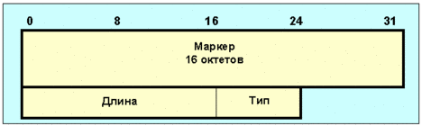 Рис. 4.4.11.4.1. Формат BGP-сообщений об изменениях маршрутов Поле маркер содержит 16 октетов и его содержимое может легко интерпретироваться получателем. Если тип сообщения "OPEN", или если код идентификации в сообщении open равен нулю, то поле маркер должно быть заполнено единицами. Маркер может использоваться для обнаружения потери синхронизации в работе BGP-партнеров. Поле длина имеет два октета и определяет общую длину сообщения в октетах, включая заголовок. Значение этого поля должно лежать в пределах 19-4096. Поле тип представляет собой код разновидности сообщения и может принимать следующие значения: