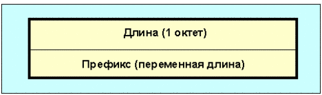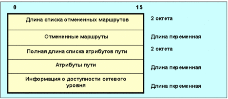 Рис. 4.4.11.4.3 Формат update-сообщения Если длина списка отмененных маршрутов равна нулю, ни один маршрут не отменен, а поле отмененные маршруты в сообщении отсутствует. Поле отмененные маршруты имеет переменную длину и содержит список IP-адресных префиксов маршрутов, которые стали недоступны. Каждая такая запись имеет формат: