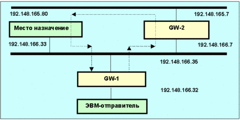 Рис. 4.4.11.4.4. Пример разных маршрутов для пути "туда" и "обратно". Предполагается, что оператор находится в ЭВМ-отправителе. Команда traceroute 192.148.166.33 в этом случае выдаст:
