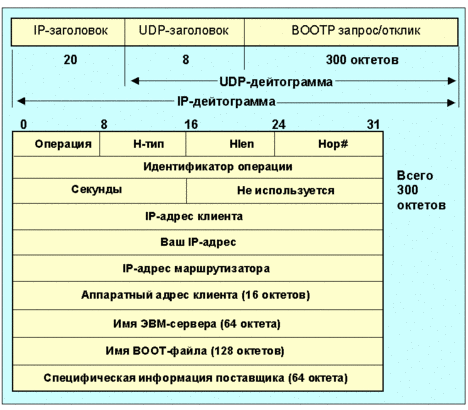 Оглавление: Телекоммуникационные технологии Вперёд: 4.4.11. Протоколы маршрутизации (обзор, таблицы маршрутизации, вектор расстояния) 4.4.10. Протокол загрузки BOOTPСемёнов Ю.А. (ГНЦ ИТЭФ), book.itep.ruВ больших сетях некоторые рабочие станции (например, Х-терминалы) могут не иметь системного диска, а операционная система и сетевое программное обеспечение загружается через сеть. Для этого рабочая станция должна иметь стартовую программу, записанную в ПЗУ. Такое постоянное запоминающее устройство часто производится на фирме, изготовившей эту рабочую станцию, и по этой причине не содержат информации ни об адресе сервера, ни даже о своем IP-адресе. Выше был описан протокол RARP, который способен решать подобные задачи для случая, когда сервер находится в пределах данной локальной сети. Ведь RARP выдает широковещательный запрос на связном уровне, а он не ретранслируется маршрутизаторами. Более мощным средством для загрузки бездисковых станций является протокол BOOTP (Bootstrap протокол, RFC-951, -1048, -1532). BOOTP пригоден и для загрузки бездисковых маршрутизаторов. BOOTP в качестве транспортного использует UDP-протокол. ЭВМ-клиент (порт=68), которая хочет воспользоваться BOOTP, посылает широковещательное сообщение (по адресу = 255.255.255.255). Сервер (порт=67) в отличии от случая RARP не обязательно должен находиться в пределах данной локальной сети. В поле IP-адрес клиента будет записано 0.0.0.0, так как клиент пока не знает своего адреса. Получив запрос через порт 67, маршрутизатор помещает свой IP-адрес в поле IP-адрес маршрутизатора (см. формат запроса на рис. 4.4.10.1) и пересылает запрос действительному BOOTP-серверу, увеличив на 1 значение поля Hop#. По пути к серверу может быть несколько маршрутизаторов (но обычно не больше 3). Сервер не знает физического адреса клиента. Воспользоваться ARP-запросом он не может, так как клиент пока не знает своего IP-адреса и на ARP-запрос не откликнется. У сервера, получившего запрос, имеется две возможности. 1. Проанализировать пакет, извлечь из него физический адрес клиента и скорректировать ARP-таблицу. Так как программа загрузки находится на прикладном уровне, и ей запрещено исправлять ARP-таблицы, реально доступен только второй путь. Использование разных номеров портов для сервера и клиента делает работу системы более эффективной. Когда отклик сервера является широковещательным, это позволяет не прерывать работу прикладных программ, работающих с номерами портов, отличными от 68 (порт Bootp-клиента). В Bootp ответственность за надежность связи лежит на ЭВМ-клиенте. При отсутствии отклика в отведенное время клиент повторяет Bootp-запрос. На IP-уровне, где данные не имеют контрольной суммы, целостность сообщения не гарантирована. Bootp требует, чтобы проверка контрольной суммы обязательно проводилась на UDP-уровне (следует заметить, что обычно это не является обязательным). Сервер читает UDP-дейтограммы через порт 67. Для повышения надежности обменов, как правило, блокируется фрагментация дейтограмм. Загрузка рабочих станций часто запускается броском напряжения сетевого питания. При этом несколько Bootp-процессов стартуют одновременно. Для того чтобы снизить вероятность столкновений, величина времени тайм-аута выбирается случайно в интервале 0-4сек. После каждого повторного запроса это время удваивается. Верхнее значение тайм-аута равно 60сек. Для справок время загрузки бе
