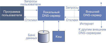 Оглавление: Телекоммуникационные технологии Вперёд: 4.4.12.1. Протокол динамического конфигурирования ЭВМ DHCP 4.4.12. DNS (структура, обработка запросов, ресурсные записи)Семёнов Ю.А. (ГНЦ ИТЭФ), book.itep.ruГлавной ЭВМ любой системы является та, на которой работаете вы. Но помимо этой машины и маршрутизатора локальной сети не последнюю роль играет сервер имен (DNS-система, RFC-4032, -4034, -4035, -2137, -2052, -2136, -1996, -1918, -1793, -1712-13, -1706, -1664, -1611-12, -1536-37, -1401, -1383, -1183, -1101, -1034-35). Сервер имен это программа управления распределенной базой данных, в которой хранятся символьные имена сетей и ЭВМ вместе с их IP-адресами. Наиболее распространенным программным продуктом, решающим данную задачу является BIND (Berkrley Internet Name Domain). Иногда для этой цели выделяют специальную машину. Задача DNS - преобразование символьного имени в IP-адрес и наоборот в условиях, когда число узлов Internet растет экспоненциально, совсем не проста. Сама иерархическая система имен (DNS) настроена на упрощение решения этой проблемы. Схема взаимодействия программы пользователя с локальным и удаленными DNS-серверами показана ниже на рисунке 4.4.12.1.