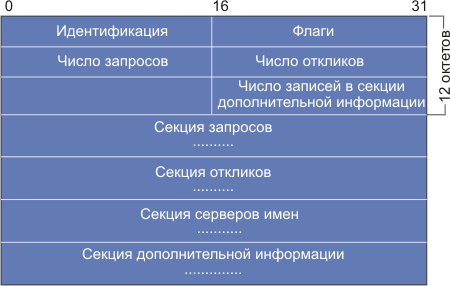 Рис. 4.4.12.3. Формат DNS-сообщений Каждое сообщение начинается с заголовка, который содержит поле идентификация, позволяющее связать в пару запрос и отклик. Поле флаги определяет характер запрашиваемой процедуры, а также кодировку отклика. Поля число... определяют число записей соответствующего типа, содержащихся в сообщении. Так число запросов задает число записей в секции запросов, где записаны запросы, требующие ответов. Каждый вопрос состоит из символьного имени домена, за которым следует тип запроса и класс запроса. Значения битов поля флаги в сообщении сервера имен отображены в таблице 4.4.12.2. Разряды пронумерованы слева направо, начиная с нуля рис. 4.4.12.4.