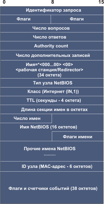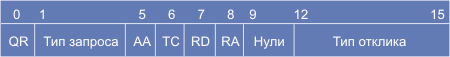 Поле символьное имя домена имеет переменную длину, содержит одно или более субполей, начинающихся с байта длины (0-63). Поле завершается 0. Например, для ns.itep.ru (цифры представляют собой октеты длины): В реальной нотации байты длины субполя могут иметь два старших бита равные 1, что преобразует интервал значений из 0-63 в 192-255. Такой байт в поле означает, что это не мера длины секции, а 16-битный указатель, 14 бит которого являются смещением от начала DNS-сообщения, указывающим на место продолжения секции. Смещение для первого байта поля идентификации равно нулю. Эти ухищрения придуманы для сокращения длины сообщений, так как одно и то же имя домена в отклике может повторяться много раз. Поле тип запроса характеризует разновидность запроса: Таблица 4.4.12.3.. Разновидности полей тип запроса и их коды