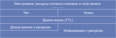 (Пропущенные коды являются устаревшими или экспериментальными). Последние две строки в таблице 4.4.12.3 относятся только к запросам. Поле класс запроса позволяет использовать имена доменов для произвольных объектов (все официальные имена Интернет относятся к одному классу [IN] - 1). В сообщении DNS-сервера каждая из секций (дополнительной информации, ответов или узловых серверов имен) состоит из набора ресурсных записей, которые описывают имена доменов и некоторую другую информацию (например, их адреса). Появление ресурсных полей в DNS базе данных придают ей новые качества. Каждая запись описывает только одно имя, формат этих записей отображен на рис. 4.4.12.6.