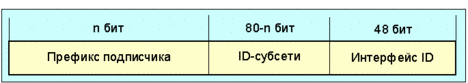 Рис. 4.4.1.1.3 Где 48-битовый идентификатор интерфейса представляет собой IEEE-802 MAC адрес. Использование IEEE 802 mac адресов в качестве идентификаторов интерфейсов будет стандартным в среде, где узлы имеют IEEE 802 MAC адреса. В других средах, где IEEE 802 MAC адреса не доступны, могут использоваться другие типы адресов связного уровня, такие как E.164 адреса, в качестве идентификаторов интерфейсов. Включение уникального глобального идентификатора интерфейса, такого как IEEE MAC адрес, делает возможным очень простую форму авто-конфигурации адресов. Узел может узнать идентификатор субсети, получая информацию от маршрутизатора в виде сообщений оповещения, которые маршрутизатор посылает связанным с ним партнерам, и затем сформировать IPv6 адрес для себя, используя IEEE MAC адрес в качестве идентификатора интерфейса для данной субсети. Другой формат уникастного адреса относится к случаю, когда локальная сеть или организация нуждаются в дополнительных уровнях иерархии. В этом примере идентификатор субсети делится на идентификатор области и идентификатор субсети. Формат такого адреса имеет вид: