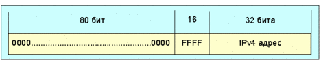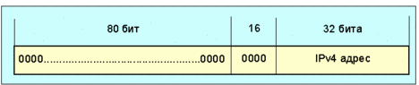 Рис. 4.4.1.1.5 Определен и второй тип IPv6 адреса, который содержит внутри IPv4 адрес. Этот адрес используется для представления IPv6 адресов узлам IPv4 (тем, что не поддерживают IPv6). Этот тип адреса называется "IPv4-mapped IPv6 address" и имеет формат показанный на рис. 4.4.1.1.6: