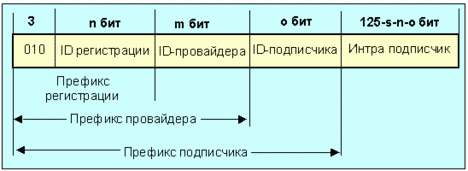 Рис. 4.4.1.1.8 4.9. Провайдерские глобальные уникаст-адресаГлобальный уникаст-адрес провайдера имеет назначение, описанное в [ALLOC]. Исходное назначение этих уникаст-адресов аналогично функции IPv4 адресов в схеме CIDR [см. CIDR]. Глобальный IPv6 уникаст-адрес провайдера имеет формат, отображенный ниже на рис. 4.4.1.1.9: