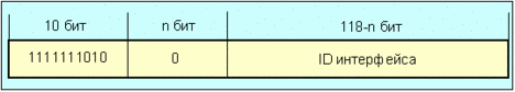 Рис. 4.4.1.1.9. Глобальный адрес провайдера Старшая часть адреса предназначена для определения того, кто определяет часть адреса провайдера, подписчика и т.д. Идентификатор регистрации определяет регистратора, который задает провайдерскую часть адреса. Термин "префикс регистрации" относится к старшей части адреса, включая поле идентификатор регистрации (ID). Идентификатор провайдера задает специфического провайдера, который определяет часть адреса подписчика. Термин "префикс провайдера" относится к старшей части адреса включая идентификатора провайдера. Идентификатор подписчика позволяет разделить подписчиков, подключенных к одному и тому же провайдеру. Термин "префикс подписчика" относится к старшей части адреса, включая идентификатор подписчика. Часть адреса интра-подписчик определяется подписчиком и организована согласно местной топологии Интернет подписчика. Возможно, что несколько подписчиков пожелают использовать область адреса интра-подписчик для одной и той же субсети и интерфейса. В этом случае идентификатор субсети определяет специфический физический канал, а идентификатор интерфейса - определенный интерфейс субсети. 4.10. Локальные уникаст-адреса IPv6Существует два типа уникастных адресов локального использования. Имеется локальные адреса сети и канала. Локальный адрес канала предназначен для работы с одним каналом, а локальный адрес сети - с одной локальной сетью (site). Локальный IPv6 уникаст-адрес канала имеет формат, отображенный ниже на рис. 4.4.1.1.10: