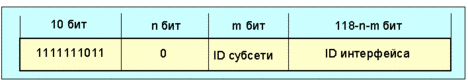 Рис. 4.4.1.1.10. Локальный адрес канала Локальные адреса канала предназначены для обращения через определенный канал, например, для целей авто-конфигурации адресов, поиска соседей или в случае отсутствия маршрутизатора. Маршрутизаторы не должны переадресовывать пакеты с локальными адресами отправителя. Локальный адрес сети имеет формат, показанный на рис. 4.4.1.1.11: