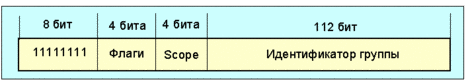 Рис. 4.4.1.1.12 Префикс субсети в эникастном адресе является префиксом, который идентифицирует определенный канал. Этот эникастный адрес является синтаксически идентичным уникастному адресу для интерфейса канала с идентификатором интерфейса равным нулю. Пакеты, посланные группе маршрутизаторов с эникастным адресом, будут доставлены всем маршрутизатам субсети. При этом все маршрутизаторы субсети должны поддерживать работу с эникастными адресами. Реальный обмен будет осуществлен лишь с тем маршрутизатором, который ответит первым. Эникастный адрес маршрутизатора субсети предполагается использовать в приложениях, где необходимо взаимодействовать с одним из совокупности маршрутизаторов удаленной субсети. Например, когда мобильный хост хочет взаимодействовать с одним мобильным агентом в его “домашней” субсети. 4.12. Мульткаст-адресаМультикастинг-адрес IPv6 является идентификатором для группы узлов. Узел может принадлежать к любому числу мультикастинг групп. Мультикастинг-адреса имеют следующий формат (рис. 4.4.1.1.13):