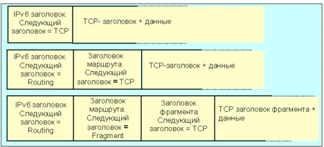 Приложения должны считать все остальные адреса уникастными, если противоположное не оговорено при конфигурации (например, эникастные адреса). 5. Заголовки расширения IPv6В IPv6, опционная информация уровня Интернет записывается в отдельных заголовках, которые могут быть помещены между IPv6 заголовком и заголовком верхнего уровня пакета. Существует небольшое число таких заголовков, каждый задается определенным значением кода поля следующий заголовок. В настоящее время определены заголовки: маршрутизации, фрагментации, аутентификации, инкапсуляции, опций hop-by-hop, места назначения и отсутствия следующего заголовка. Как показано в примерах ниже, IPv6 пакет может нести нуль, один, или более заголовков расширения, каждый задается предыдущим полем следующий заголовок (рис. 4.4.1.1.15):