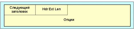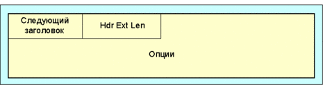 Рис. 4.4.1.1.25. Формат заголовка опции места назначения Следующий заголовок - 8-битовый селектор. Идентифицирует тип заголовка, который непосредственно следует за заголовком опций места назначения. Использует те же коды протокола, что и IPv4 [RFC-1700]. Hdr Ext Len - 8-битовое целое без знака. Длина заголовка опций места назначения в 8-октетных блоках, исключая первые 8 октетов. Опции - поле переменной длины, кратное 8 октетам. Содержит одну или более TLV-закодированных опций. Здесь определены только две опции места назначения Pad1 и padn. Обратите внимание, что существует два способа кодировки опционной информации места назначения для пакетов IPv6: в заголовке опций места назначения, или в виде отдельного заголовка расширения. Заголовок фрагмента и заголовок идентификации являются примерами последнего подхода. Какой из подходов будет применен, зависит от того, какая операция желательна в узле места назначения: