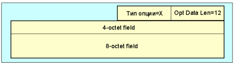 Эти предположения определяют следующий подход к выкладке полей опций: порядок опций от коротких к длинным без внутреннего заполнения. Требования выравнивания границ для всей опции определяется требованием выравнивания наиболее длинного поля (до 8 октетов). Этот подход иллюстрируется на следующих примерах: Пример 1 Если опция x требует двух полей данных, одно длиной 8 октетов, а другое длиной 4 октета, ее формат будет иметь вид (рис. 4.4.1.1.27):