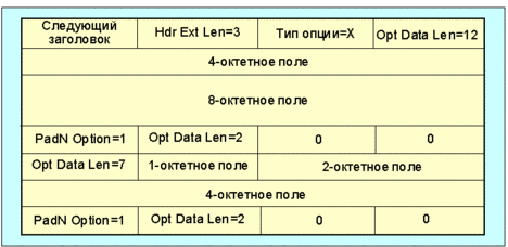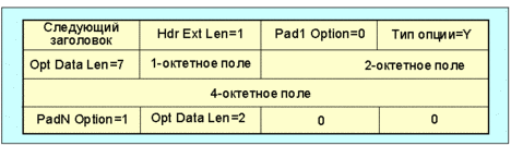 Рис. 4.4.1.1.29 Требование выравнивания выглядит как 4n+3, и призвано гарантировать, что 4-октетное поле начнется со смещением кратным 4 по отношению к началу завершающего заголовка. Полный заголовок (hop-by-hop или destination options), содержащий одну из указанных опций будет иметь вид (рис. 4.4.1.1.30):