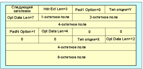 Существует две опции заполнения, которые используются, когда необходимо выровнять последующие опции и вывести границу заголовка на значение кратное 8 октетам. Эти заполняющие опции должны распознаваться всеми приложениями IPv6: Опция Pad1 (выравнивание не требуется) Опция Pad1 используется для введения одного октета заполнителя в зону опций заголовка. Если требуется более одного октета, используется опция Padn. Опция padn (выравнивание не требуется)