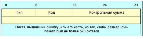 (e.1) сообщения об ошибке ICMPv6, или (e.2) пакета, направленного по IPv6 мультикаст-адресу (существует два исключения из этого правила: (1) сообщения packet too big - пакет слишком велик) - чтобы позволить скорректировать MTU прохода, и (2) сообщения parameter problem (проблема с параметрами), Код 2, оповещающий о нераспознанной опции), или (e.3) мультикастинг-пакета канального уровня, (исключения пункта e.2 применимы и здесь), или (e.4) широковещательного пакета канального уровня, (исключения пункта e.2 применимы и здесь), или (e.5) пакета, чей адрес отправителя не однозначно определяет какой-то узел, например, не специфицированный адрес IPv6, мультикаст-адрес IPv6 или эникаст-адрес. (f) Наконец, узел IPv6 должен ограничить частоту посылки сообщений об ошибке, если адресат на них не реагирует. Это ограничит загрузку канала. Существует много способов ограничения частоты посылки сообщений, например: (f.1) Таймерный метод. Передача сообщений производится не чаще, чем раз за указанное число T миллисекунд. (f.2) Метод полосы пропускания. Сообщения об ошибке должны занимать не более определенной доли F полосы пропускания канала. Ограничивающие параметры (например, T или F в вышеприведенных примерах) должны задаваться узлом со значениями по умолчанию (напр., T = 1 сек, и F = 2%, не 100%!). 20.3. Сообщения об ошибках ICMPv6