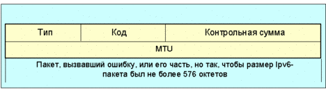 Рис. 4.4.1.1.35. Сообщение packet too big (пакет слишком велик) Поля IPv6: Адрес места назначения копируется из поля адрес отправителя пакета, вызвавшего ошибку. Поля ICMPv6: Тип 2 Описание Сообщение packet too big (пакет слишком велик) должно посылаться маршрутизатором в ответ на получение пакета, который не может быть переадресован, из-за того, что он длиннее, чем MTU выходного канала. Информация в этом сообщении используется в качестве части процесса определения MTU прохода [RFC-1191]. Пришедшее сообщение packet too big должно быть передано протоколу верхнего уровня. Формат сообщения о превышении времени аналогичен формату сообщения о недостижимости адресата (рис. 4.4.1.1.33). Поля ICMPv6: Тип 3 Не используется. Это поле не используется при всех значениях поля код. Оно должно быть обнулено отправителем и игнорироваться получателем. Описание Если маршрутизатор получает пакет с предельным значением числа шагов равным нулю (hop limit = 0), или маршрутизатор после декрементации получил нулевое значение поля hop limit, он должен выбросить такой пакет и послать отправителю пакета сообщение ICMPv6 о превышении времени (time exceeded) со значением поля код равным 0. Это указывает на зацикливание маршрута или на слишком малое значение поля hop limit. Посылая сообщение ICMPv6 о превышении времени (time exceeded) со значением поля код равным нулю, маршрутизатор должен рассматривать входной интерфейс, в соответствии с правилом выбора адреса отправителя (d). Пришедшее сообщение time exceeded должно быть передано протоколу верхнего уровня.