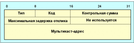 Рис. 4.4.1.1.38. Сообщения участия в группе Поля IPv6: В сообщении-запросе о членстве в группе запрашивается мультикаст-адрес группы. В отчете о членстве в группе или в сообщении о сокращении членства в группе сообщается мультикаст-адрес группы. Поле Hop Limit = 1 (предельное число шагов) Тип 130 - Запрос членства в группе В сообщениях запросах - это максимальное время в миллисекундах, на которое может задержаться сообщение-отчет. В сообщениях-отчетах и сообщениях о сокращении в это поле отправитель записывает нуль, а получатель его игнорирует. Не используется. Отправитель записывает нуль, получатель игнорирует. Адрес мультикаст-группы, сообщение о которой послано. В сообщениях-запросах поле мультикаст-адреса может равняться нулю, что означает запрос ко всем группам. Описание Сообщения ICMPv6 о членстве в группе используются для передачи информации о членстве в мультикаст-группе от узлов к их ближайшим маршрутизаторам. Подробности их использования можно найти в [RFC-1112]. Литература