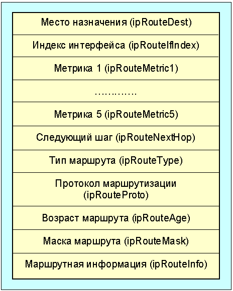 Маршруты также являются объектами mib. Согласно требованиям к mib, каждому маршруту в этой базе соответствует запись, схема которой приведена ниже на рис. 4.4.13.1.3: