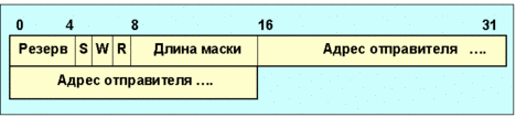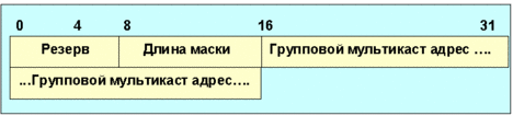 Рис. 4.4.9.5.4. Формат закодированного группового адреса Поле длина маски имеет 8 бит. Значение поля определяет число последовательных бит, выровненных по левому краю, которые определяют адрес. Маска равна или меньше длины адреса * 8 (то есть 32 бита для IPv4 и 128 для IPv6). Поле групповой мультикаст адрес содержит адрес группы и имеет число байт, равное указанному в поле длина адреса. Формат кодированного адреса отправителя показан на рис. 4.4.9.5.5.