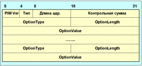Рис. 4.4.9.5.5. Формат кодированного адреса отправителя Поле бит s (бит рассеянности) содержит 1 для PIM-SM. Этот бит используется для обеспечения совместимости с PIM v.1. Поле бит W (бит WC). Бит WC =1, если подключение (join) или удаление (prune) используются для маршрутной записи (*,g) или (*,*,rp). Если wc=0, join или prune используются для маршрутной записи (s,g), где s - адрес отправителя. Сообщения join и prune, посылаемые в RP, должны иметь этот бит равным 1. Поле бит R (бит RPT). Бит RPT=1, если информация о (s,g) послана в RP. Если RPT=0, информация должна быть послана S, где S - адрес отправителя. Поле длина маски имеет длину 8 бит. Значение этого поля охарактеризовано выше в комментарии к рисунку 4.4.9.5.4. Поле адрес отправителя имеет длину, определяемую полем заголовка длина адреса. Для IPv4, она равна 4 октетам. Формат сообщения Hello показан на рис. 4.4.9.5.6. Первые два байта представляют собой заголовок PIM-сообщения. Поле optiontype определяет тип опции, значение которой задано в поле optionvalue. Поле optionlength задает длину поля optionvalue в байтах. Поле optionvalue имеет переменную длину и содержит значение опции. Поле опция может содержать следующие значения:
