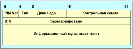 Рис. 4.4.9.5.7. Формат сообщения register Поле B - (бит border) пограничный бит. B=1, если маршрутизатор непосредственно соединен с отправителем. Поле N - бит нулевого регистра. n устанавливается DR равным 1 при тестировании RP до истечения времени регистрации (register-suppression timer). Поле информационный мультикаст-пакет представляет собой оригинальное сообщение, посланное отправителем. Сообщение register-stop является уникастным, направляемым от RP к отправителю сообщения register. IP-адрес отправителя является адресом, к которому направлялось сообщение регистрации. IP-адрес места назначения равен адресу отправителя сообщения register. Формат сообщения register-stop показан на рис. 4.4.9.5.8.