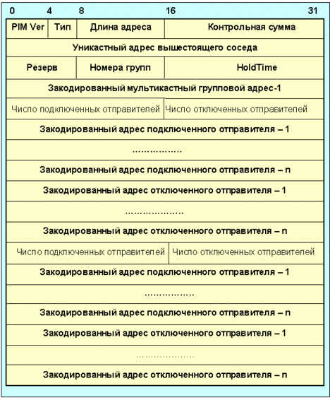Рис. 4.4.9.5.9. Формат сообщения join/prune Поле адрес вышестоящего соседа представляет собой IP-адрес RPF или вышестоящего соседа. Поле holdtime характеризует время в секундах, в течение которого получатель должен поддерживать активное состояние join/prune. Если holdtime сделано равным `0xffff', получатель сообщения отключает таймаут для данного выходного интерфейса. Если holdtime сделано равным `0', таймаут происходит немедленно. Поле число групп равно количеству мультикаст-групп, содержащихся в сообщении. Поле закодированный мультикастный групповой адрес имеет формат, показанный на рис. 4.4.9.5.4. Произвольная группа (wildcard) (*,*,rp) характеризуется адресом 224.0.0.0 и `4' в поле длина маски. Подключение (*,*,rp) имеет биты WC и RPT равные 1. Поле число подключенных отправителей равно количеству адресов подключенных отправителей для данной группы. Поля адрес подключенного отправителя -1 .. N представляют собой список отправителей, которым посылающий маршрутизатор переправляет мультикастные дейтограммы при получении их через интерфейс, на который пришло данное сообщение. Формат полей кодированного адреса отправителя следует описанию на рис. 4.4.9.5.5.